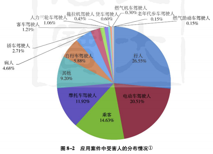 指导案例24号的应用案例以交通事故侵权案件为主,因此应用案例的受害人也多为交通事故当事人。其中,行人与电动车驾驶人为交通事故侵权案件的主要受害人,总体占比约为47%。行人占比为26.55%,与2017年(29%)相比下降了2.45%;电动车驾驶人的比例为20.51%,与2017年基本持平。其次,乘客和摩托车驾驶人成为受害人的数量也较多,总体占比分别为14.63%和11.92%,相比2017年(13%、10%)分别上升了1.63%和1.92%。自行车驾驶人成为受害人的频率也相对较高,总体占比为5.88%,其他类型的受害人相对较少(如图8-2所示)。