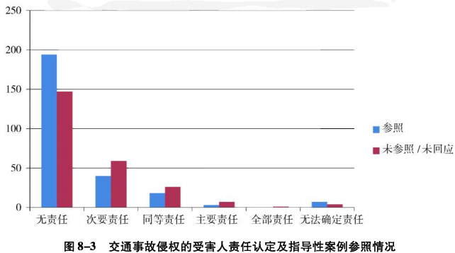 在交通事故侵权纠纷中,交通部门作出的责任认定结论主要有五大类,即无责任、次要责任、同等责任、主要责任和全部责任。在指导案例24号发布的基本案情中,交通部门认定受害人荣宝英无责任,即其对损害的产生及扩大无过错。但是实践中除受害人无责任的情形,受害人负次要责任、同等责任甚至主要责任的情形,仍有参照指导案例24号的情况存在。具体来看,在认定受害人无责任的应用案例中,参照指导性案例作出裁判的有194例;在认定受害人负次要责任、同等责任以及主要责任时,虽然应用结果为参照的案例数量都少于未参照或未回应的案例,还是有61例参照了指导案例24号,案例数量分别为40例、18例和3例。甚至在交通部门无法进行责任认定的案例中,也有7例应用案例对指导性案例进行了参照(如图8-3所示)。