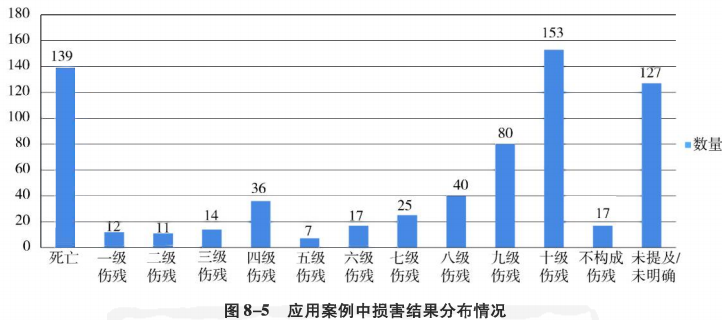 由于个人特殊体质是导致损害结果的客观原因之一,所以不同的特殊体质会导致应用案例中的损害多样,包括死亡、不同等级的伤残以及不构成伤残的情况。根据对671例应用案例损害结果的统计可知,损害结果造成不同等级伤残的共计395例,总体占比约为59%;造成受害人死亡的共计139例,总体占比近21%;不构成伤残的应用案例共计17例,总体占比不足3%;未提及或未明确伤残情况的应用案例127例,总体占比约为19%,相比2017年(17%)上升2%(如图8-5所示)。