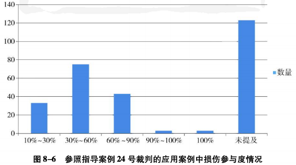 在参照指导案例24号的交通事故侵权应用案例中,有123例应用案例未提及损伤参与度,总体占比约为44%。此外,在提及损伤参与度问题的应用案例中,即使司法鉴定结果建议的损伤参与度仅有10%~30%,裁判结果也存在不减轻侵权人责任的情况。在上述案例中,无论是否提及损伤参与度或损伤参与度的程度如何,都不影响对指导案例24号的参照。由此可知,指导案例24号的适用弱化了损伤参与度在交通事故侵权纠纷案件中确定侵权人赔偿责任方面的作用。