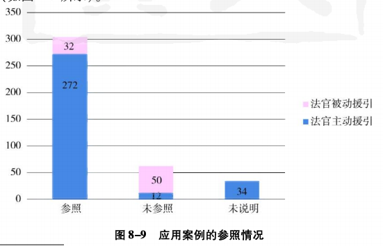 在指导案例24号的应用案例中,法官明示援引的有400例。其中法官主动援引的318例案例中应用结果参照率将近86%;未参照的有12例案例;另外还有34例应用案例的终审法官未对原审法官援引进行回应和说明;在法官被动援引的82例案例中,50例案例的应用结果为未参照,仅有32例参照了指导性案例进行裁判,法官被动援引的参照率为39%。